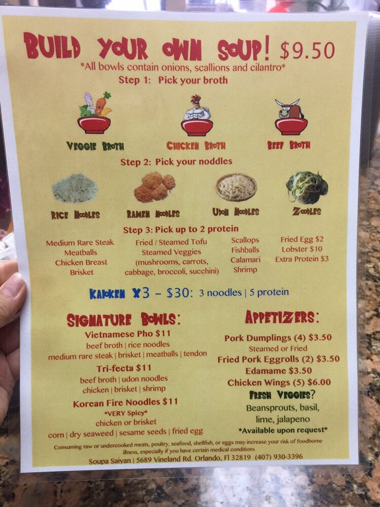 Located in Orlando, FL, Soupa Saiyan is a must-visit for fans of Asian fusion cuisine, particularly soup lovers. The menu offers a variety of options, including the popular Vegeta Rian Bowl, Vietnamese Pho Bowl, and Trifecta Bowl. For those looking to customize their meal, the Build-A-Bowl option allows for a personalized experience. Additionally, there are Kids Bowls available for younger diners.